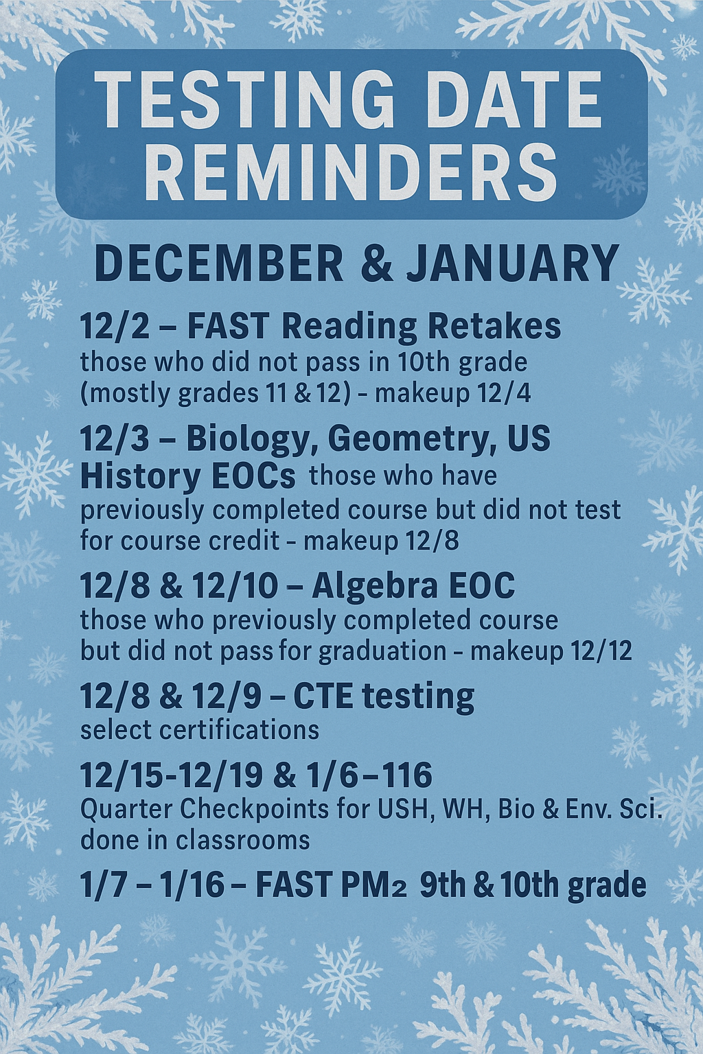 Please reach out to testing coordinator, Mrs. Mary Bennett, with questions.